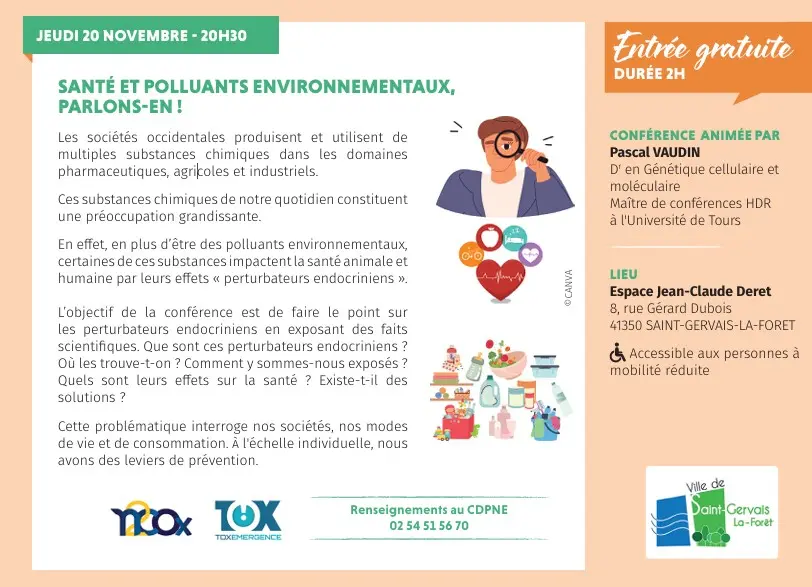 L’objectif de la conférence est de faire le point sur les perturbateurs endocriniens en exposant des faits scientifiques. Que sont ces perturbateurs endocriniens ? Où les trouve-t-on ? Comment y sommes-nous exposés ? Quels sont leurs effets sur la santé ? Existe-t-il des solutions ?