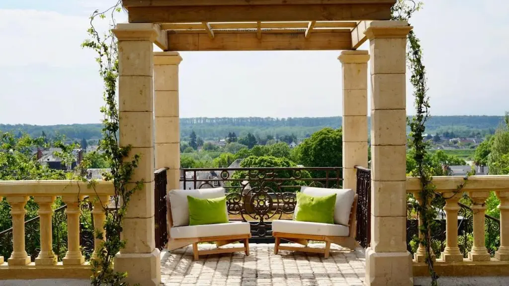 Au-delà des doubles portes arrière de la maison, les visiteurs peuvent communier avec la nature sur la vaste terrasse qui offre une vue imprenable sur la vallée de la Loire. Côté jardin à la française, un léger gargouillement de fontaine vient ajouter un sentiment de plénitude. Le reste du jardin est structuré par les plantes elles-mêmes. Une petite surprise se cache dans une petite grotte au fond de la propriété—une statue en pierre grandeur nature de Diane, la Déesse de la Chasse.
